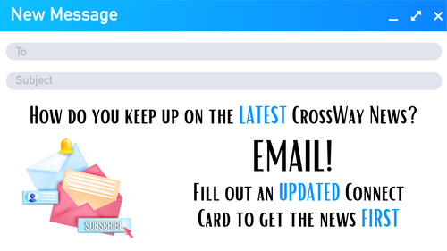 The easiest and quickest way to stay up to date with the latest CrossWay Family news, is by providing us your email so we can send you the updates, and announcements as they happen. No more waiting until Sunday to find out whats going on! If you know someone who hasn't provided their email, reach out to them & make sure they don't miss out! Emails and any other information can be written on a connect card and placed in the offering boxes or updated online by clicking the button below!